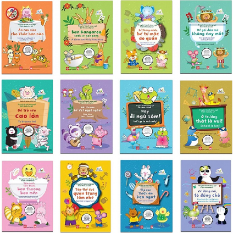 Bộ Truyện tranh song ngữ Việt-Anh cho bé gồm 12 tập là 12 câu chuyện được kể bằng tiếng Việt và tiếng Anh. Mỗi câu chuyện không chỉ mang đến những giờ phút giải trí vui vẻ, mà còn chứa đựng bài học bổ ích, khuyến khích các bé phát triển lối sống lành mạnh, có trách nhiệm, và giúp cải thiện vốn từ vựng tiếng Anh. Đây chắc chắn sẽ là món quà tuyệt vời để các bậc cha mẹ dành tặng cho những “nhà ngôn ngữ học bé nhỏ” của mình.